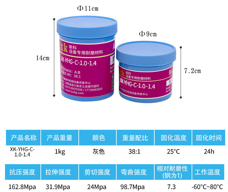 1.先預(yù)熱已噴砂的設(shè)備,再將XK-YHL-1.0高分子耐磨顆粒膠按比例混合攪拌均勻,用批刀或塑料刮板對磨損部位進(jìn)行修復(fù);